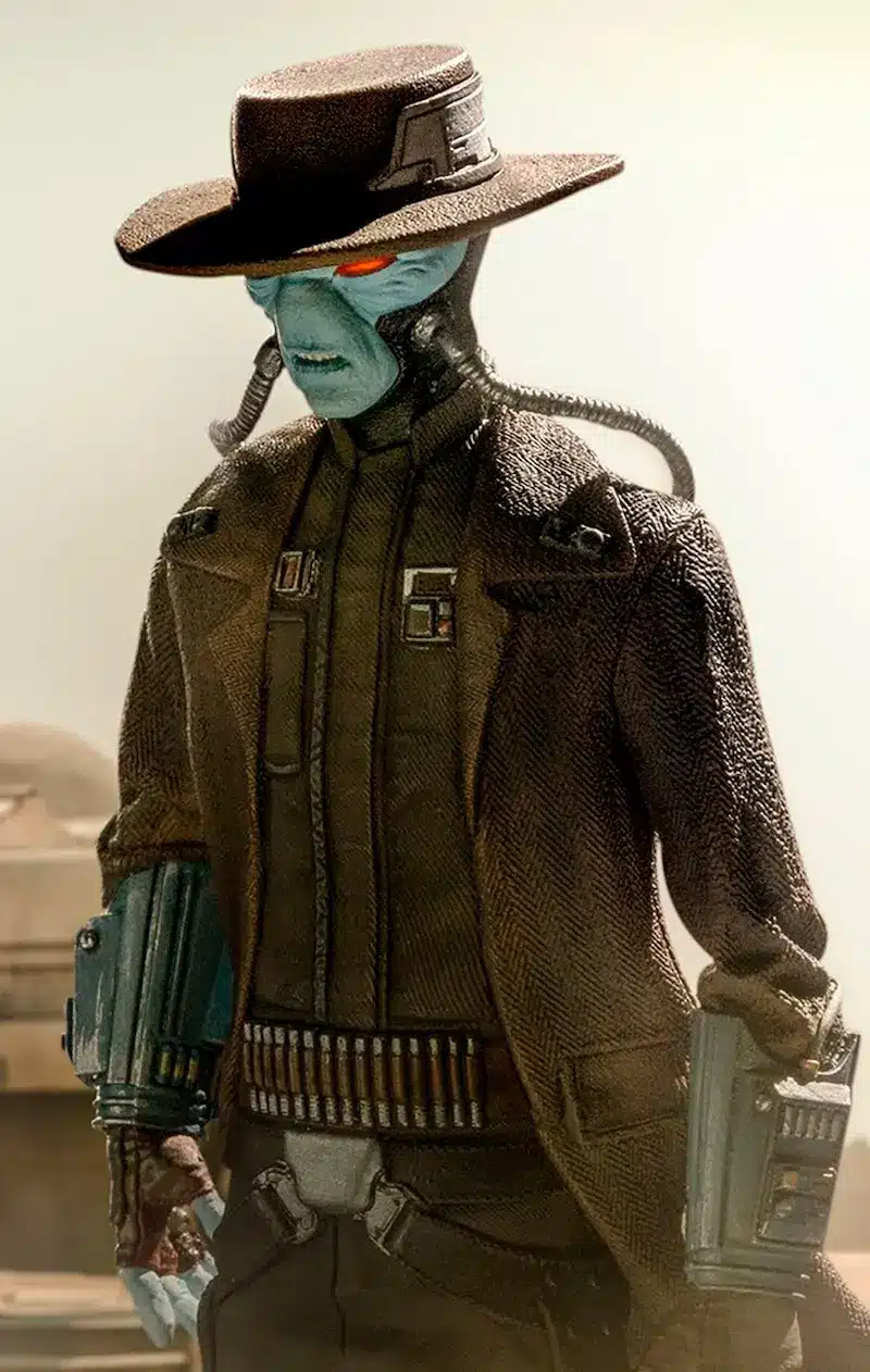 Caminando sobre las abrasadoras arenas del árido desierto del planeta Tatooine, a las puertas de la ciudad de Freetown, como un pistolero del viejo oeste americano, una figura siniestra y esbelta con crueles ojos rojos bajo su característico sombrero de ala ancha, vestido con un sombrero marrón. abrigo, coloca sus manos hábiles y rápidas, listo para sacar sus pistolas bláster gemelas LL-30 de la funda de su cinturón, desafiando al sheriff local Cobb Vanth a un duelo.